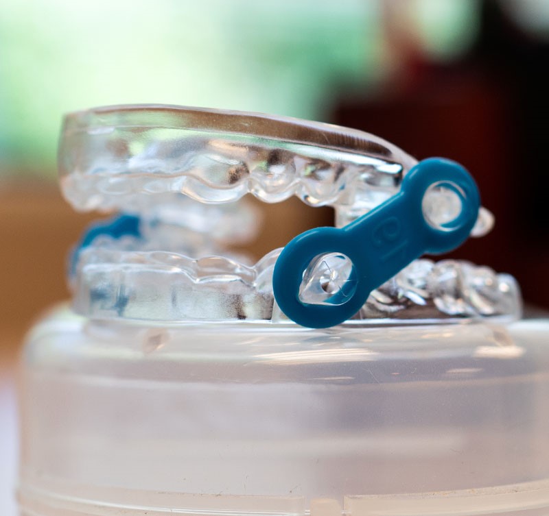 It is a removable device worn in the mouth during sleep that helps control sleep apnea and snoring, thus improving sleep quality. The appliance gently positions the lower jaw and tongue slightly forward. This opens space in the back of the throat and reduces tissue obstruction to help keep your airway open and clear during sleep.